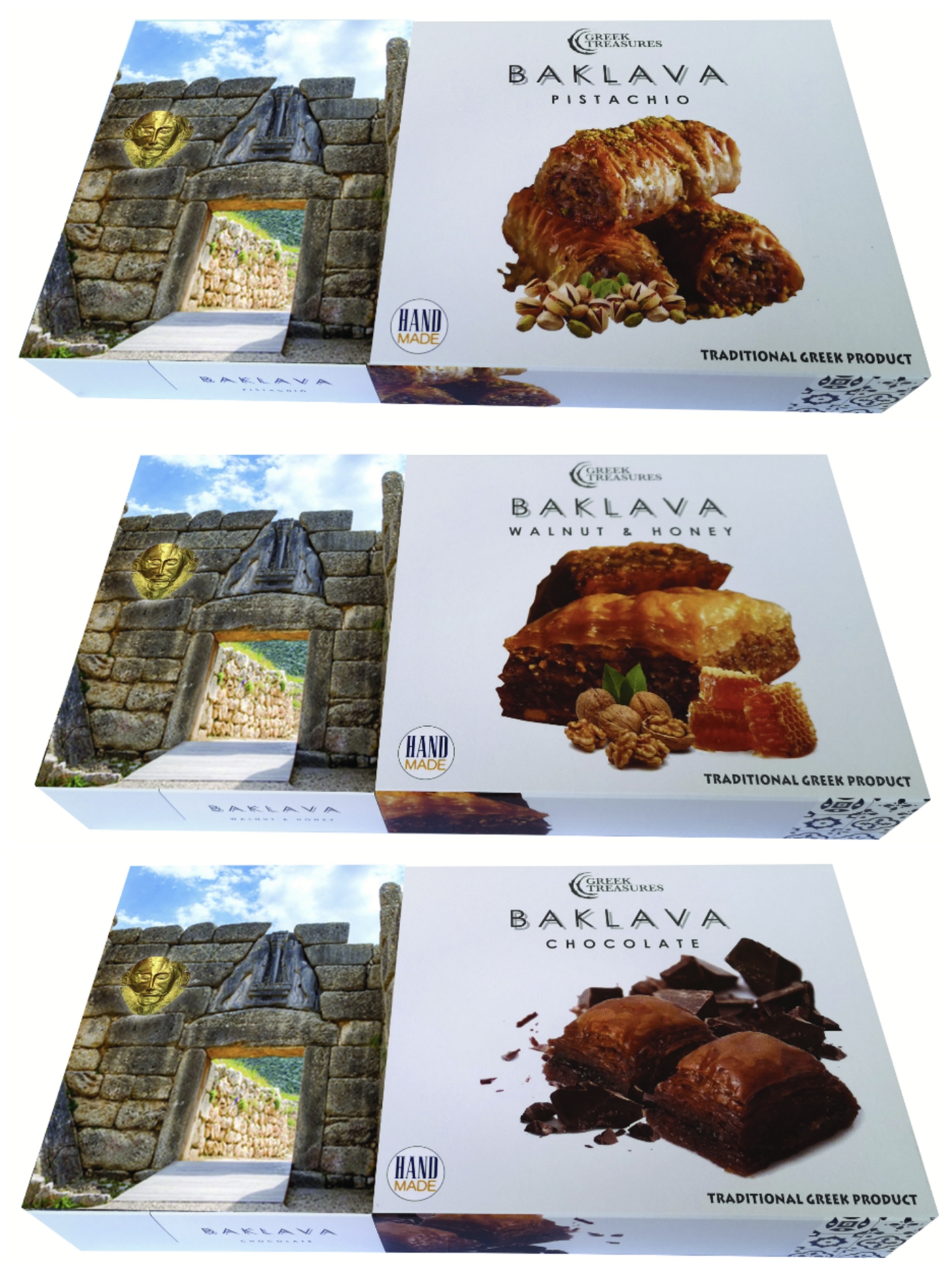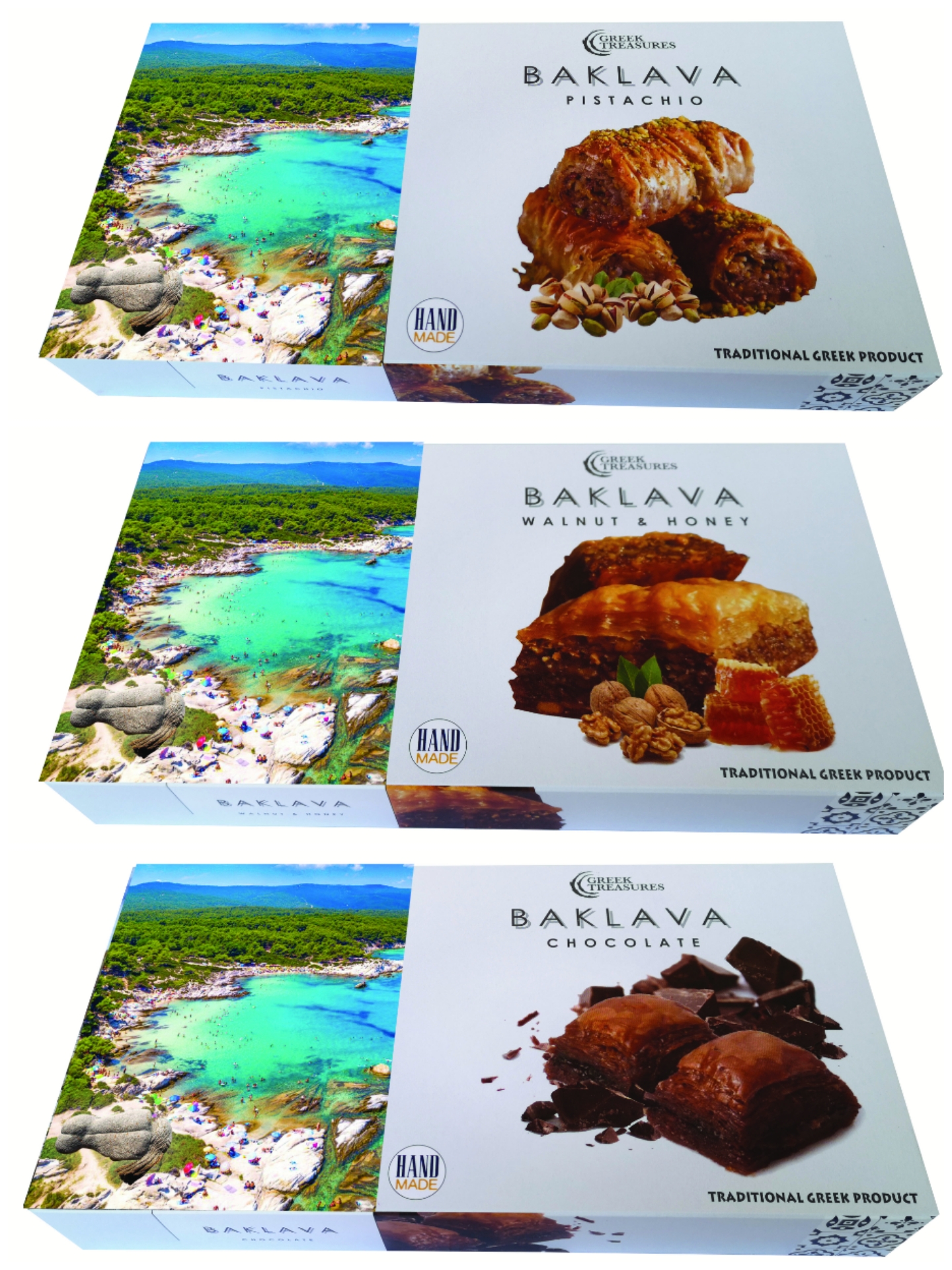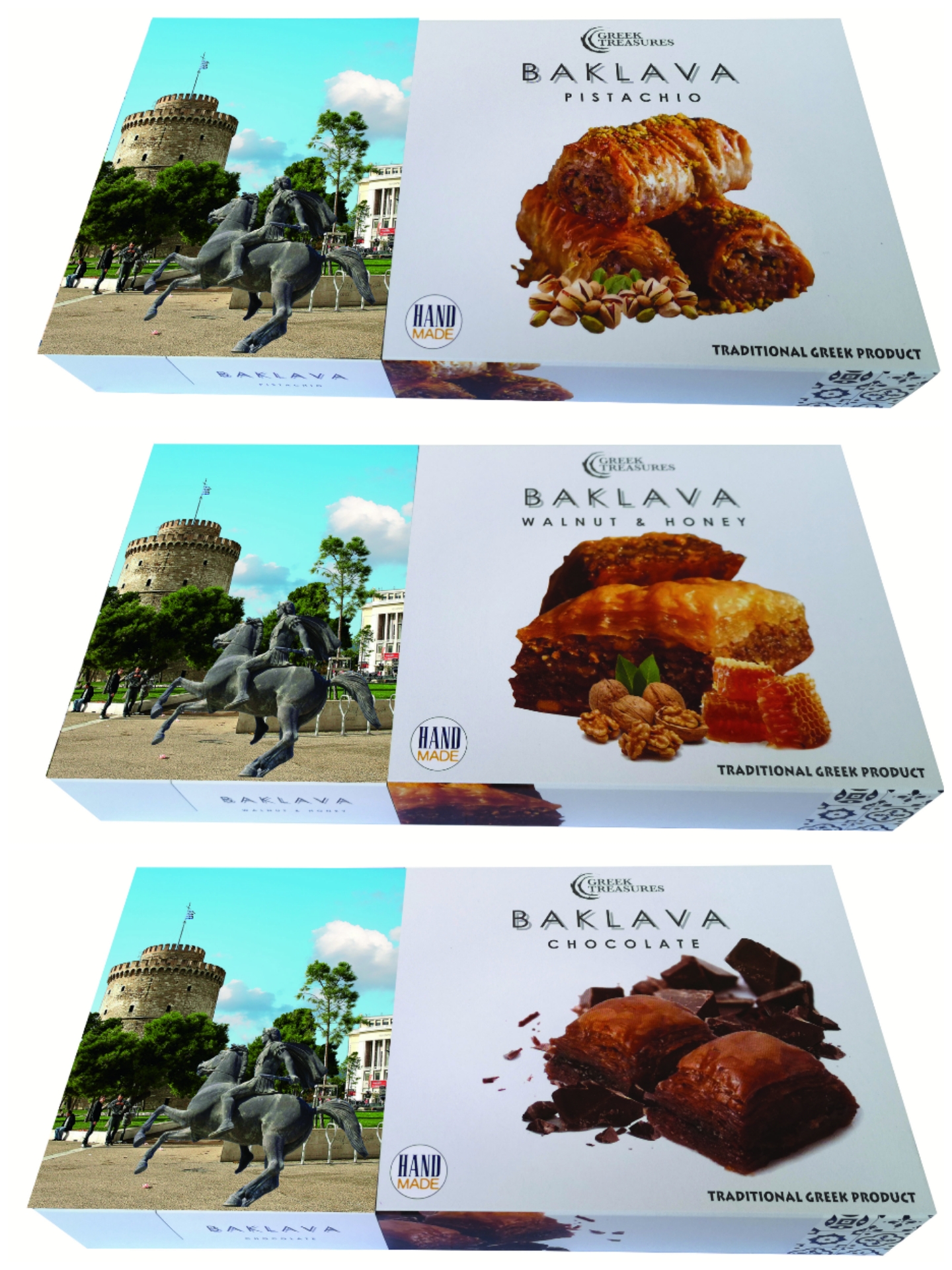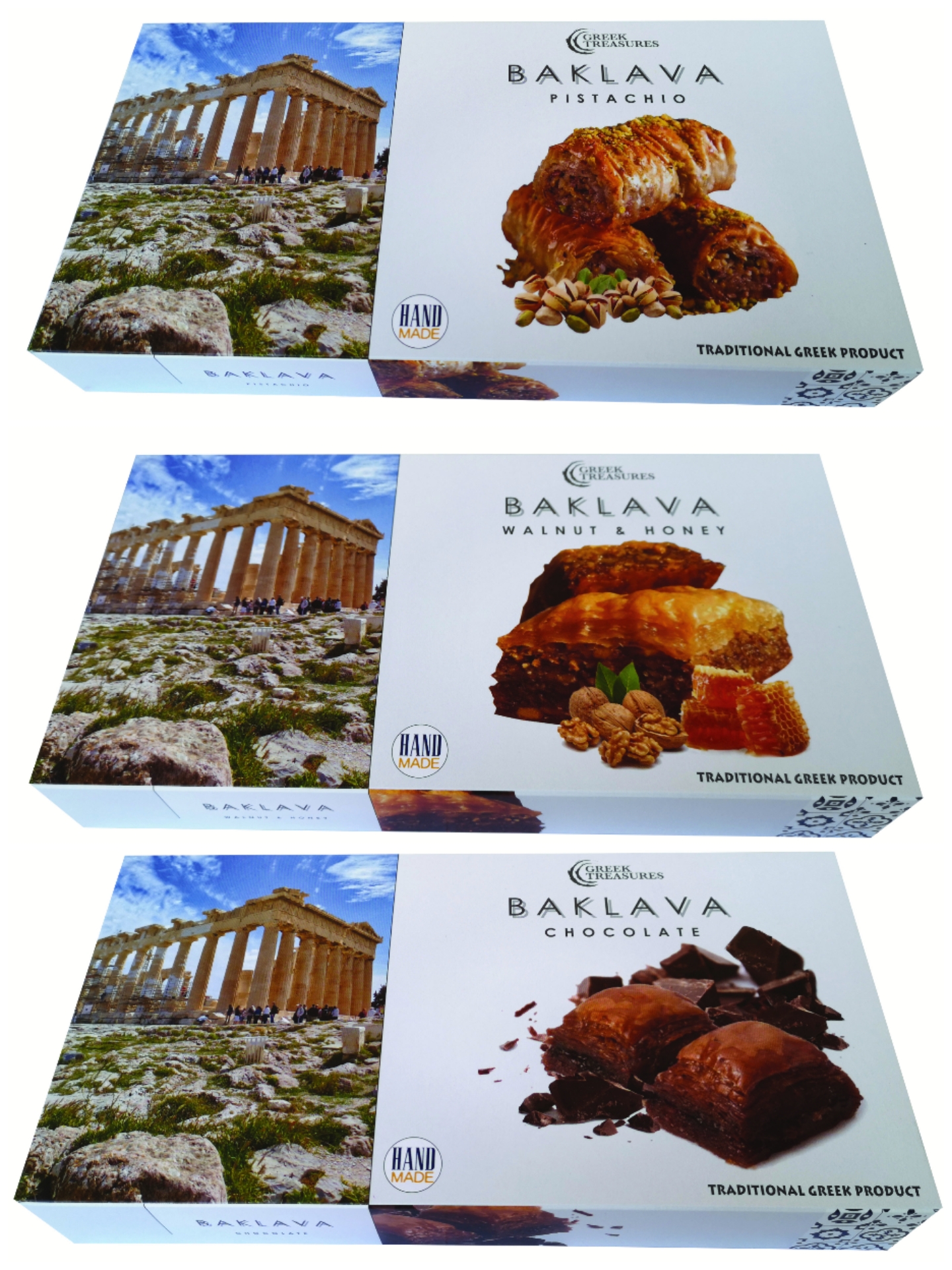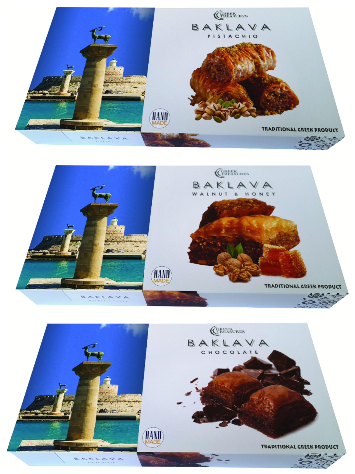 Μπακλαβάς σε συσκευασία των 200gr (5 τεμάχια) ή 240gr (6 τεμάχια) επίσης σε πρωτότυπα σχέδια που αναδεικνύουν τον αρχαίο πολιτισμό της χώρας μας και τα τοπικά χαρακτηριστικά των κατά τόπους τουριστικών περιοχών.