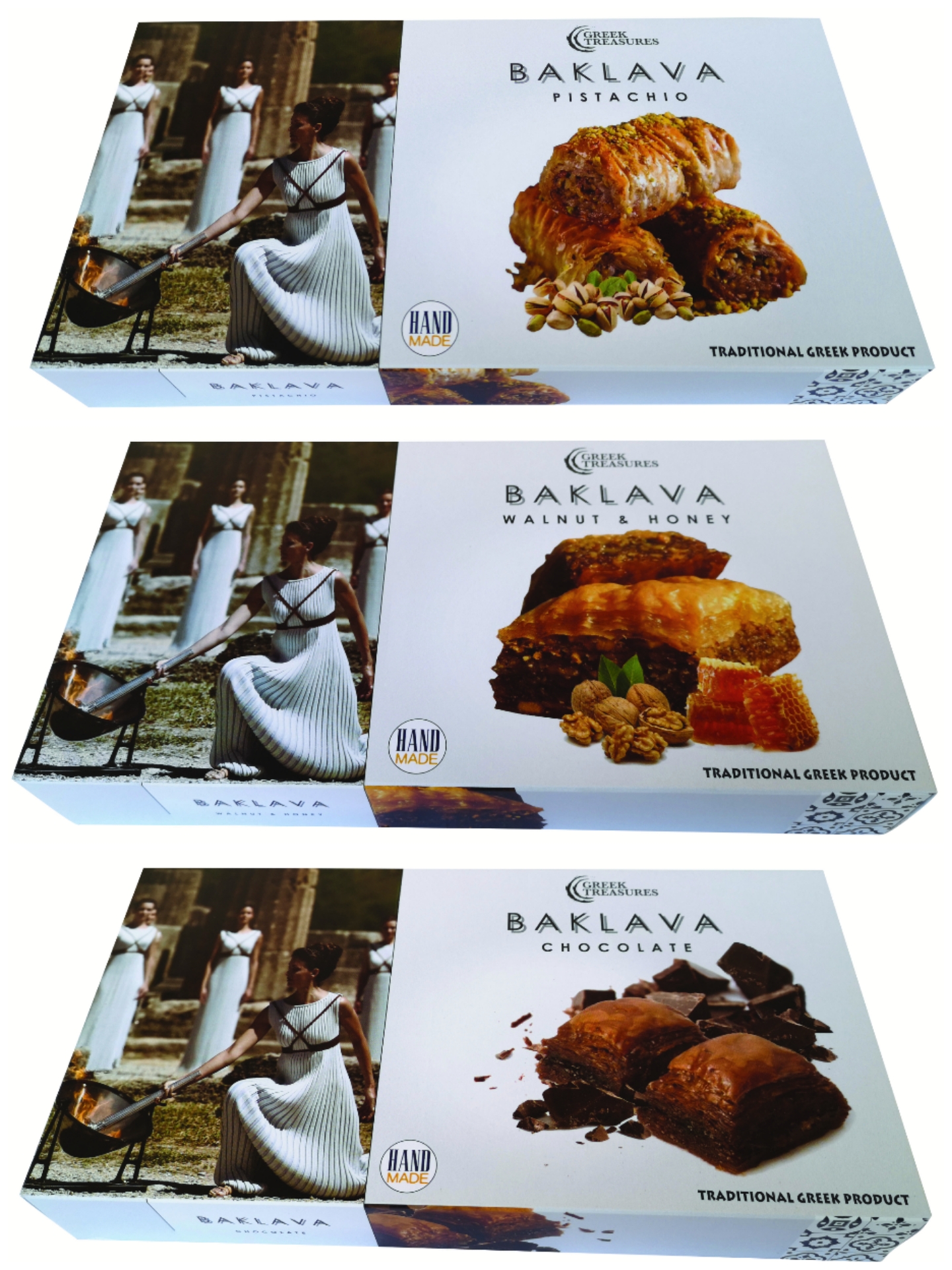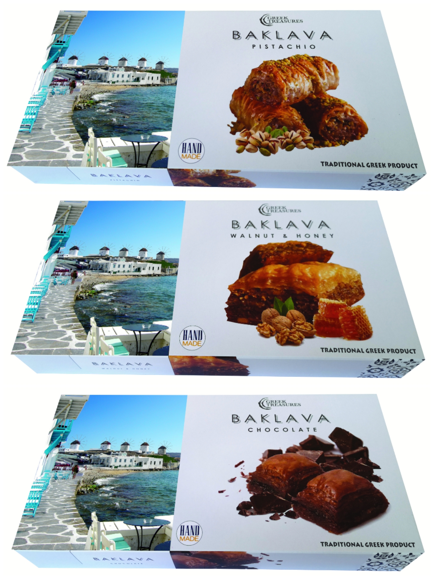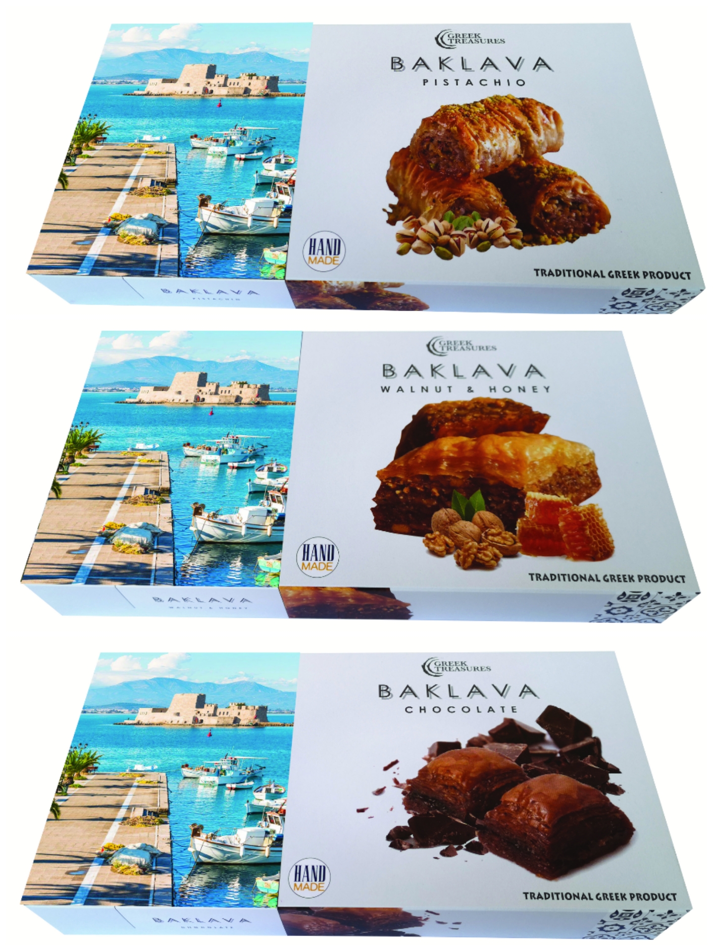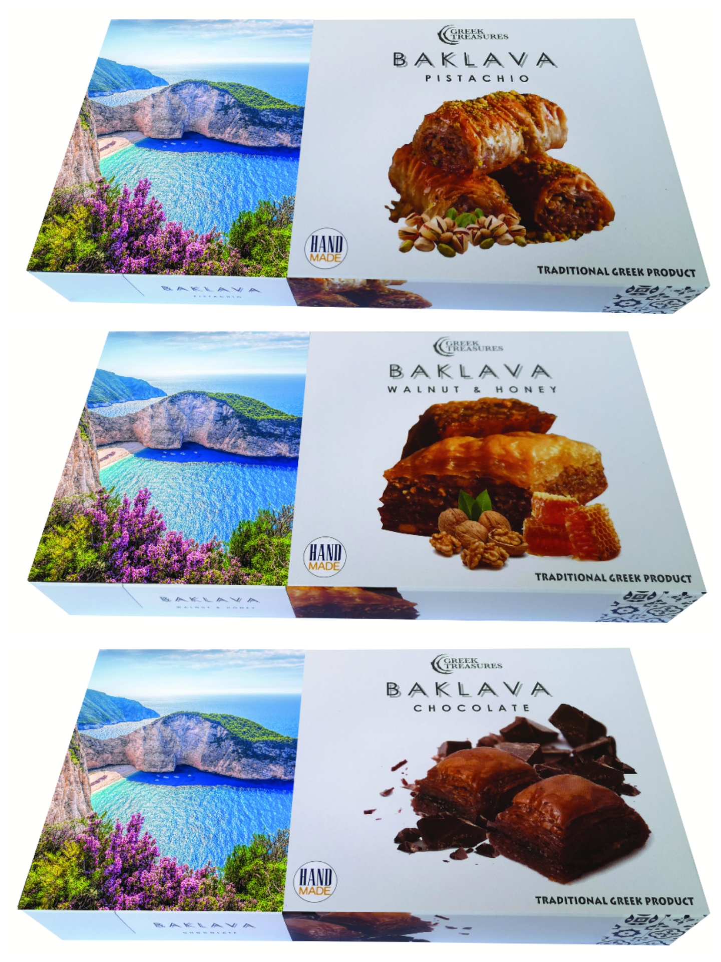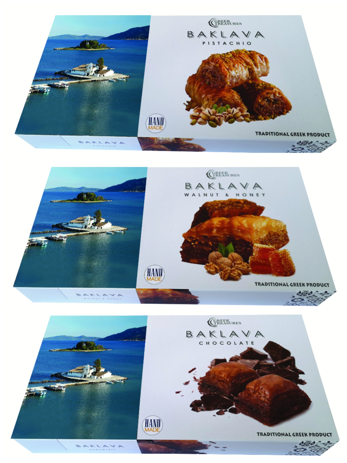Μπακλαβάς σε συσκευασία των 200gr (5 τεμάχια) ή 240gr (6 τεμάχια) επίσης σε πρωτότυπα σχέδια που αναδεικνύουν τον αρχαίο πολιτισμό της χώρας μας και τα τοπικά χαρακτηριστικά των κατά τόπους τουριστικών περιοχών.